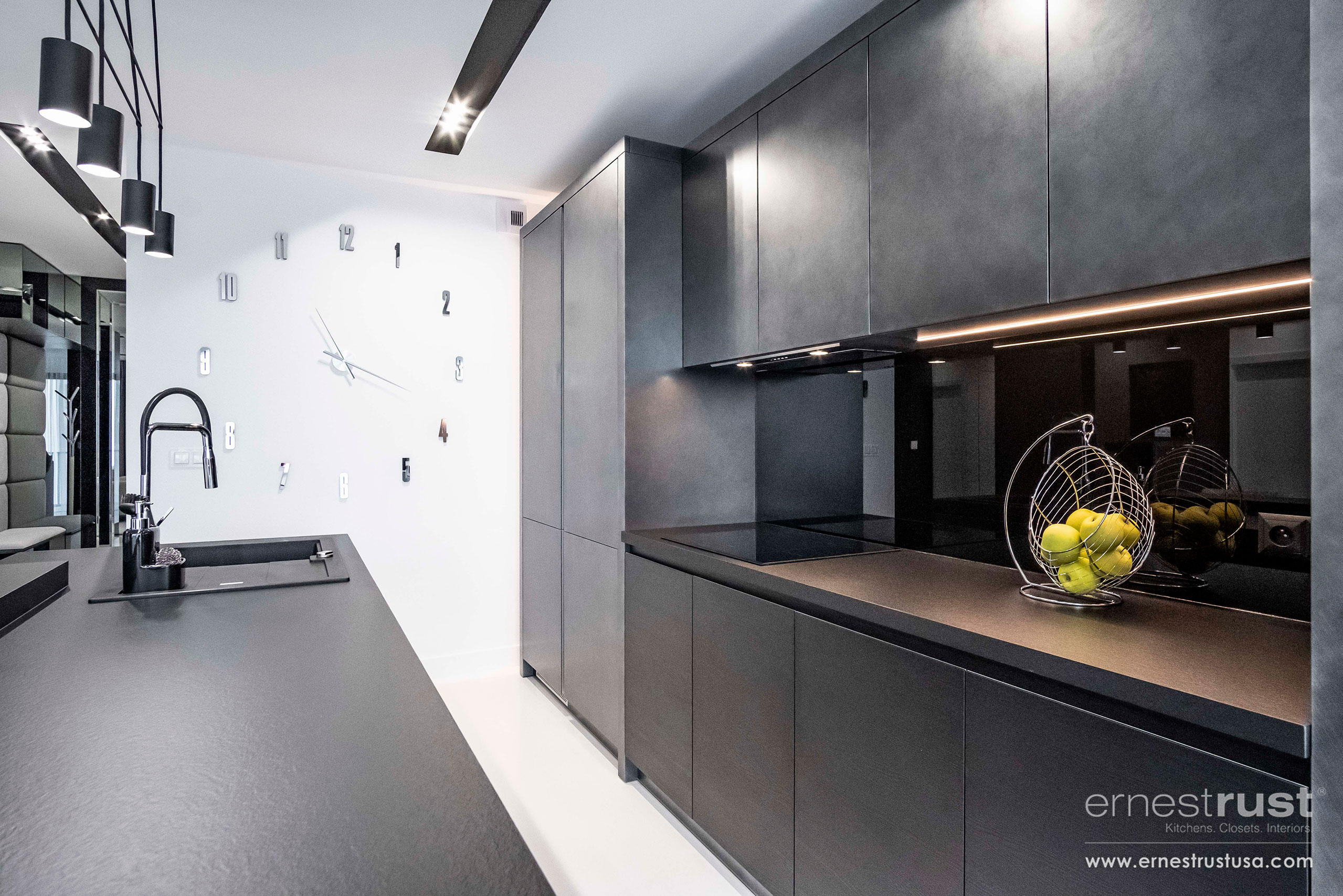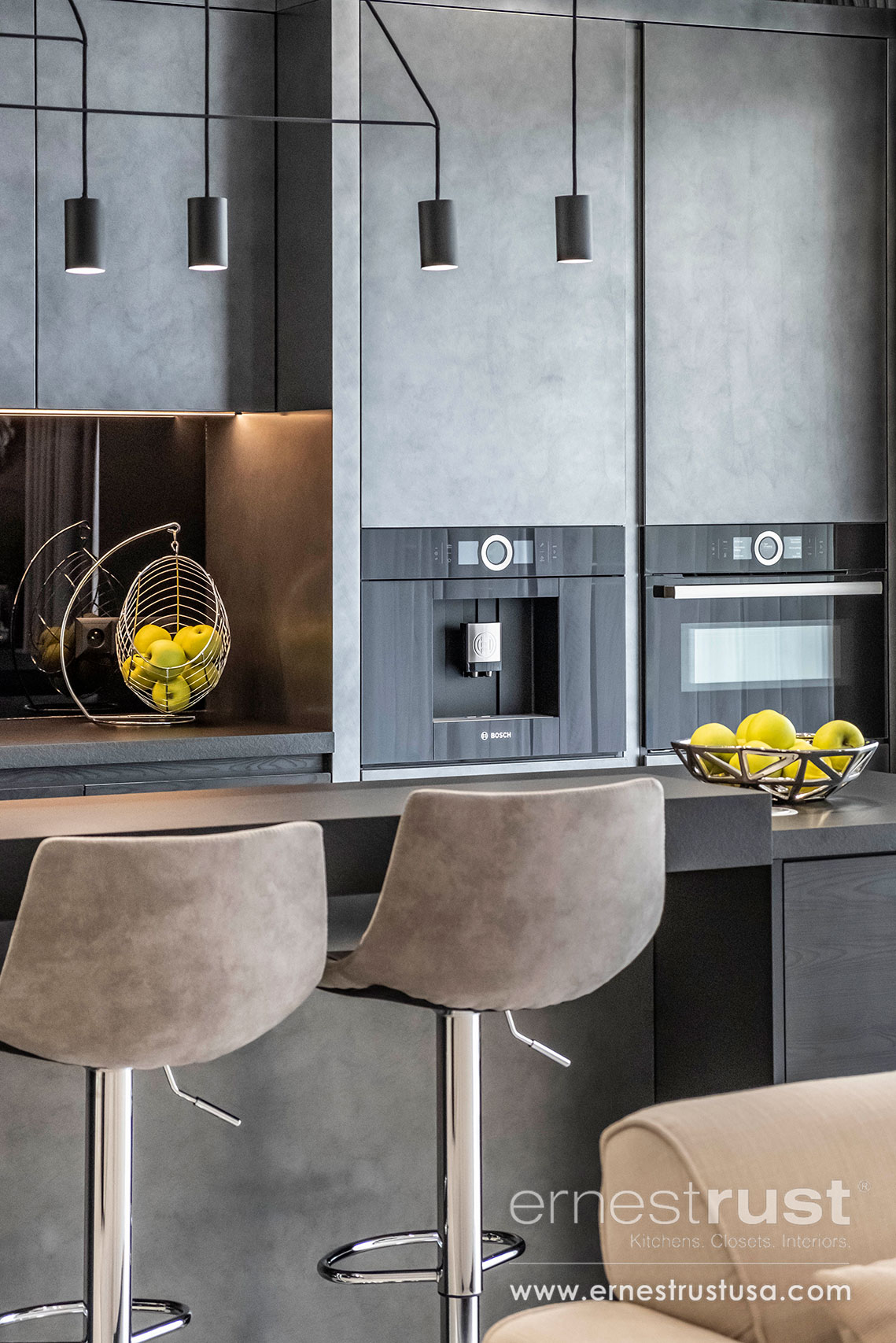 This kitchen has a very strict color scheme that was comprised of different tones of black and grey. Since the color scheme was limited to match the rest of the house, our team worked with a multitude of textures. We used a combination of soft finish and wood veneer cabinets, textured laminate and concrete countertops, as well as high gloss accents throughout. Incorporating different textured surfaces allowed us to add more dimensions as depth to an otherwise minimal color scheme.