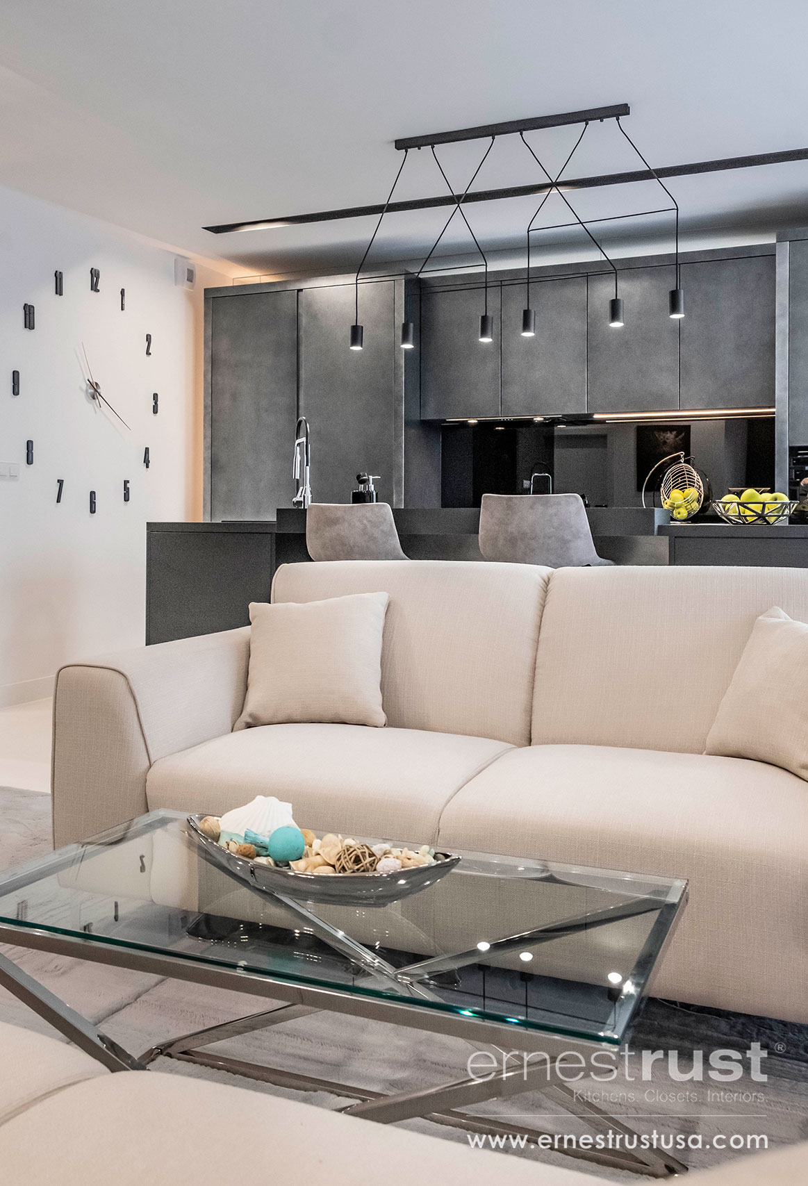 Ernest Rust is known for custom cabinetry built-ins. You will hardly ever see an Ernest Rust project without a seamless appliance built-in or custom carpentry details. This project has a custom sink with an adjacent sloped drying rack built into the Island counter top. This design allows for easy access while washing the dishes, as well as an effortless way to rinse produce while prepping food on the counter. Placing the sink on the island countertop is a strategic design hack that is ideal for hosting. Placing the sink within the counter, faced towards the living room, creates an inviting and inclusive set-up, for both the host and guests.