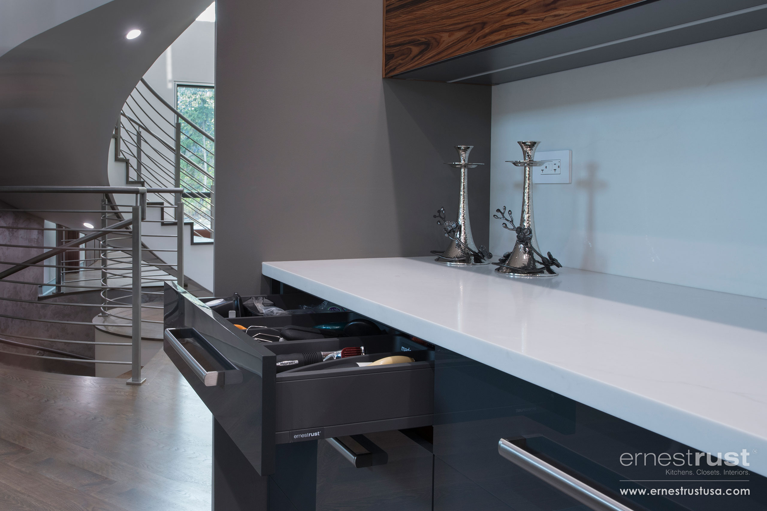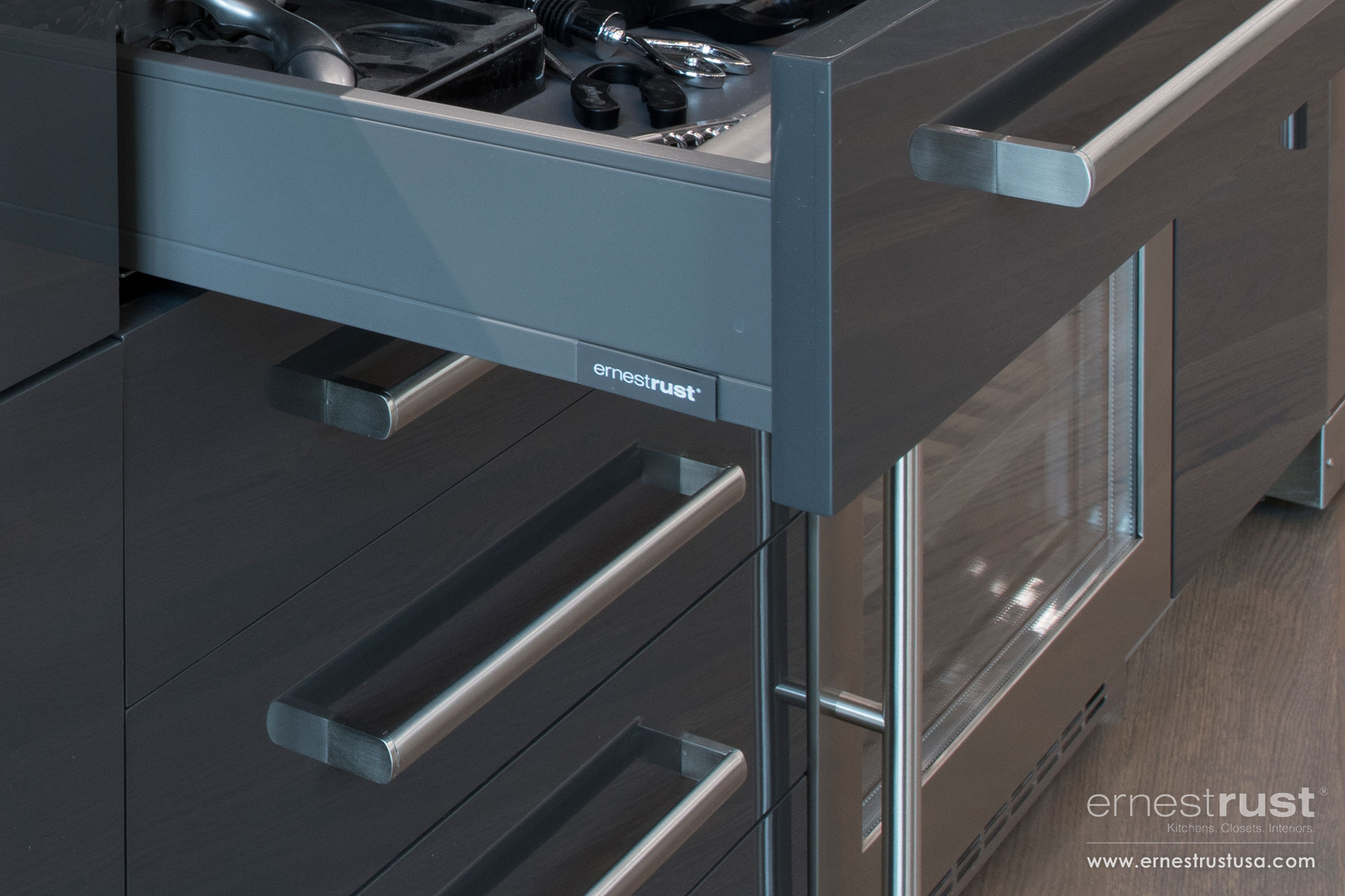 Ernest Rust not only provides top of the line materials and finishes, but we also provide ultra-modern solutions for all lifestyle needs. Customization runs deep into our line of cabinetry solutions. Each drawer and cabinet can be tailored to your wants and needs. Built-in silver wear dividers, sliding shelves, and hidden dishwashers are just the starting point when it comes to custom. Beauty is in the details with our line of Modern cabinetry and kitchens.