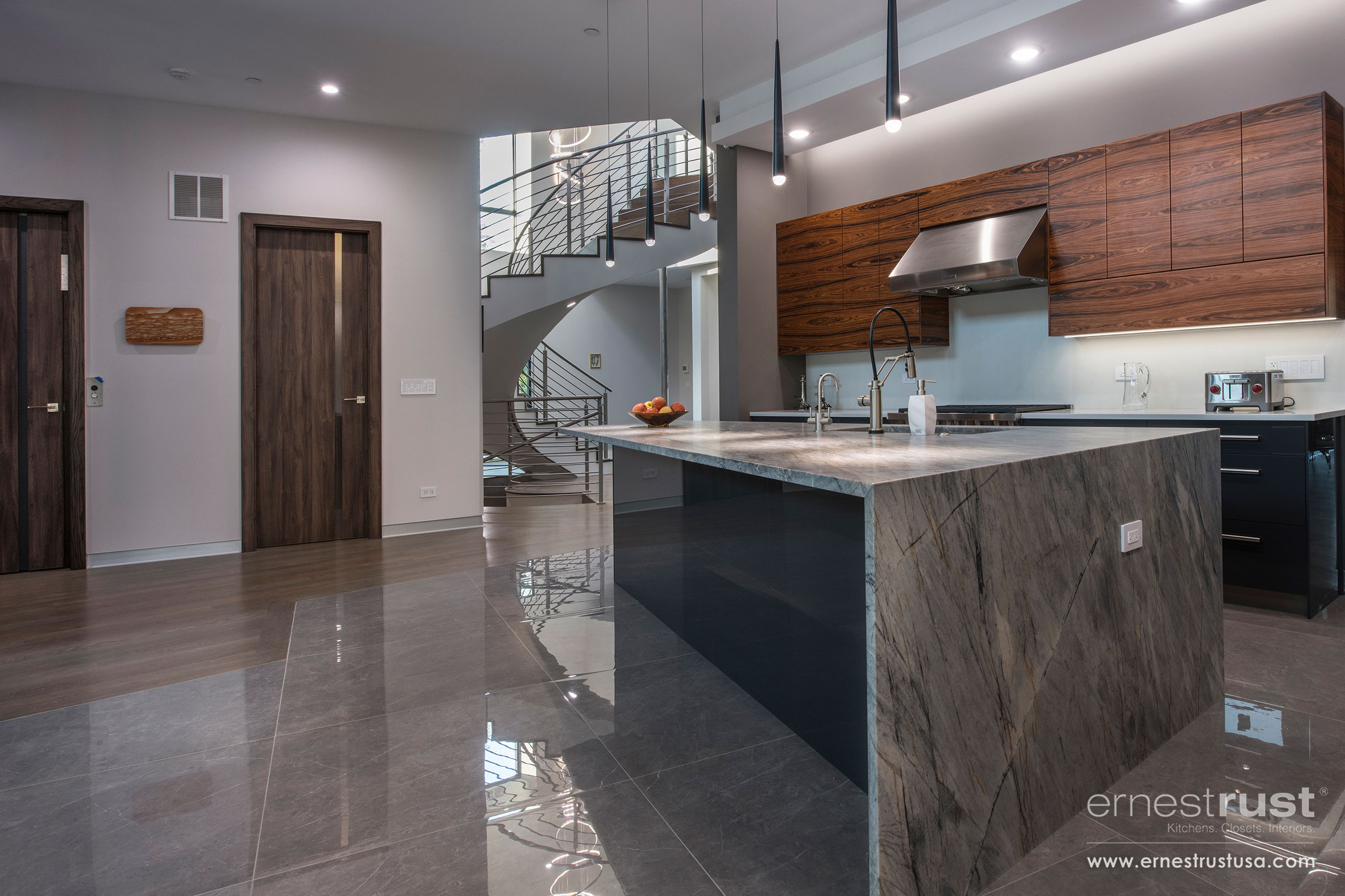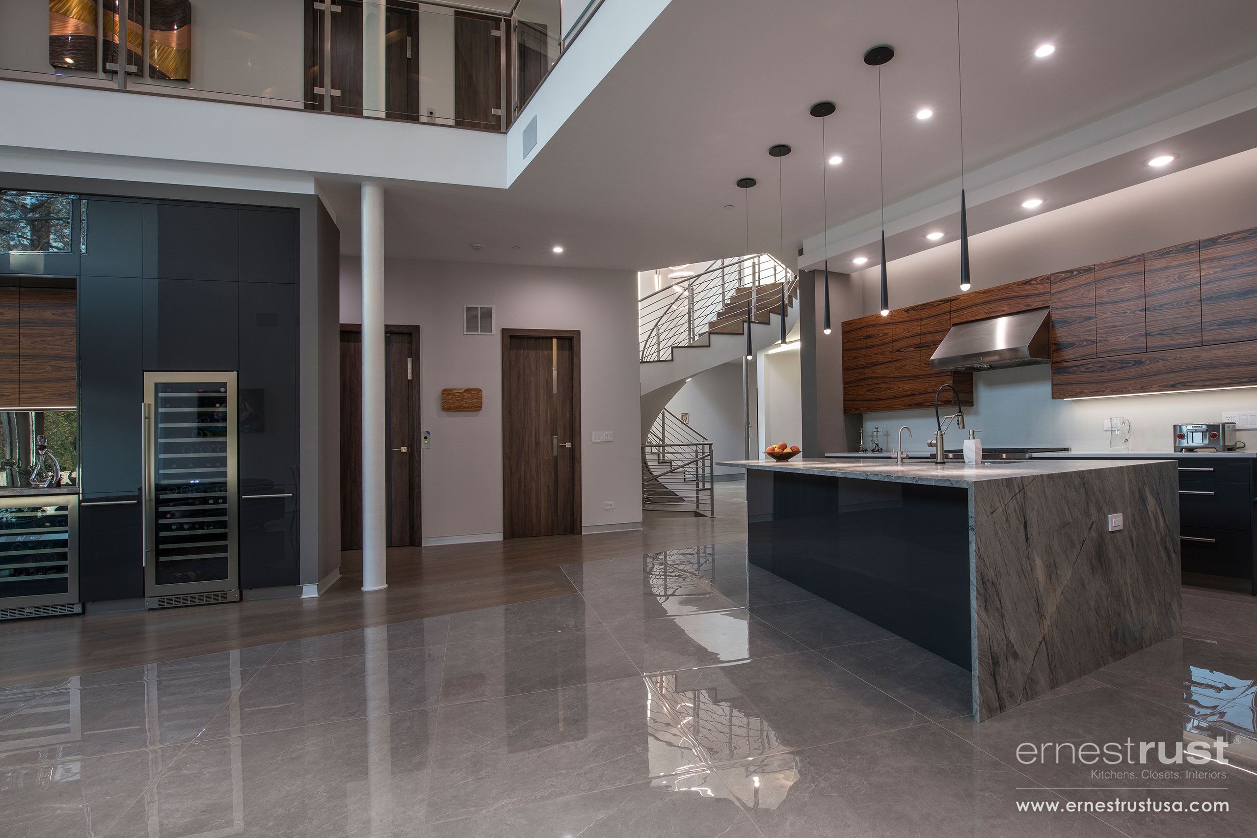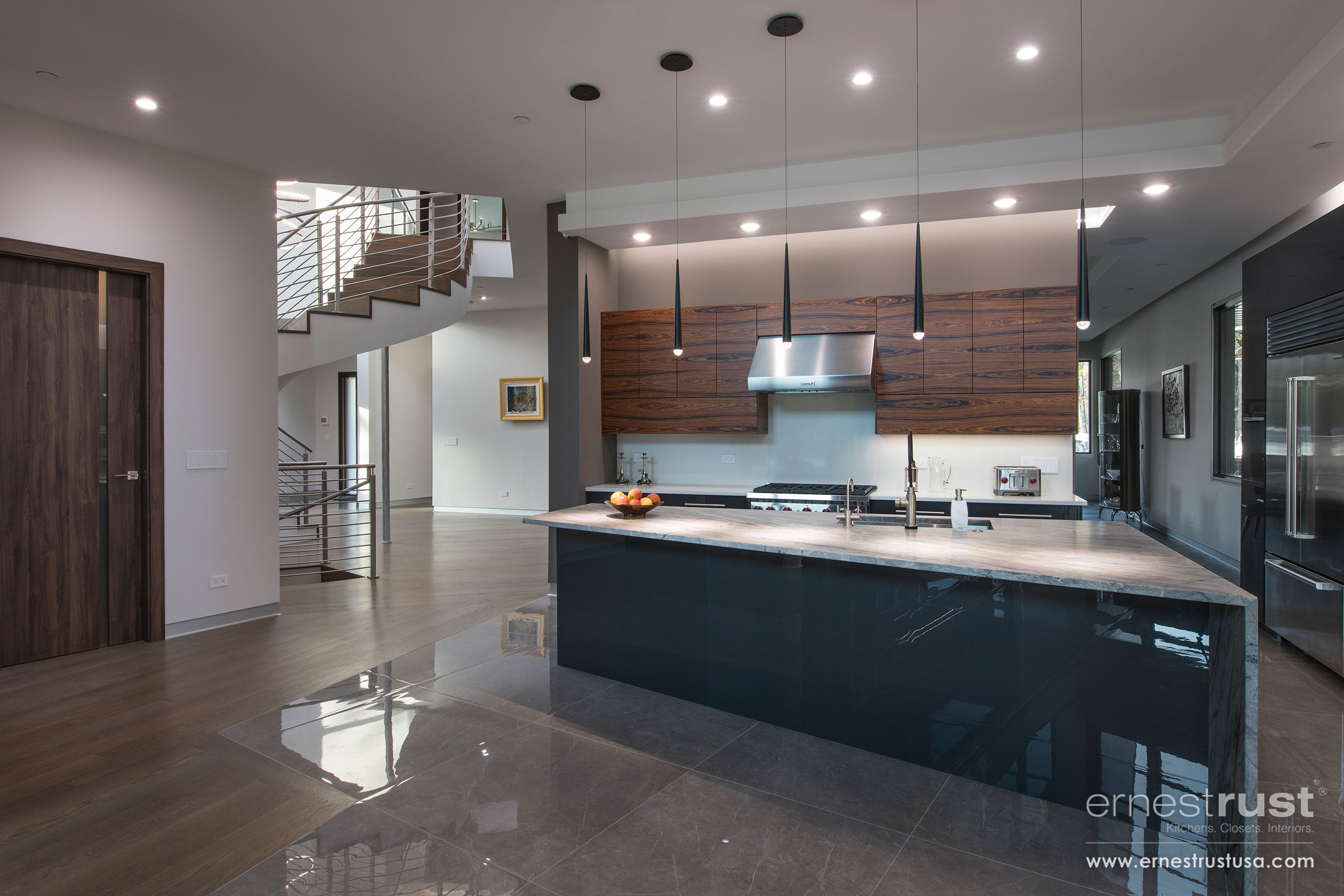 Our team had the pleasure to provide this Northbrook customer with an over-the-top modern kitchen to fit the aesthetic of their ultra-modern home. Showcasing our satin-matte varnish front, marble countertops, and natural rosewood veneer cabinetry, this kitchen is nothing short of spectacular. This project effortlessly combines several different materials and finishes and marries them together as one. Ernest Rust provides dozens of options when it comes to finishes; whether it’s a satin finish, a gloss finish, matte, or wood veneer, our inventory of selections will be able to deliver. All elements are working together to create a cohesive appearance throughout the entire home. The stainless steel handles and pulls are beautifully complementing the handpicked stainless steel appliances, as well as the stainless steel fixtures on the railings and light fixtures. It is important for our custom cabinetry to have options that suit all customers and can be effortlessly applied in every residence and project.
