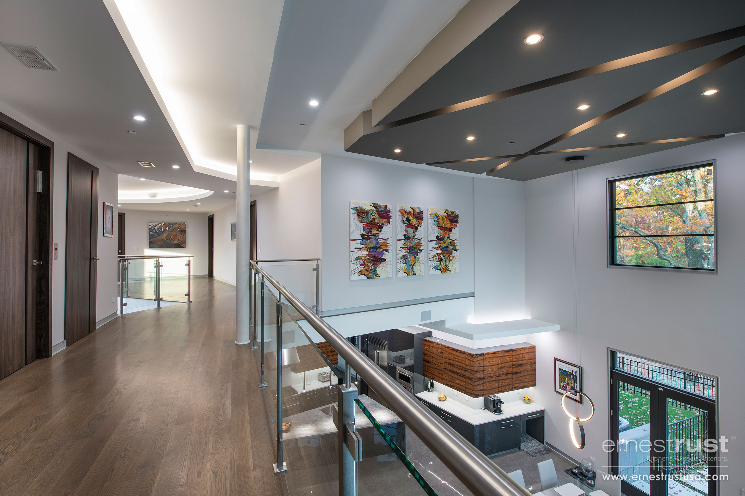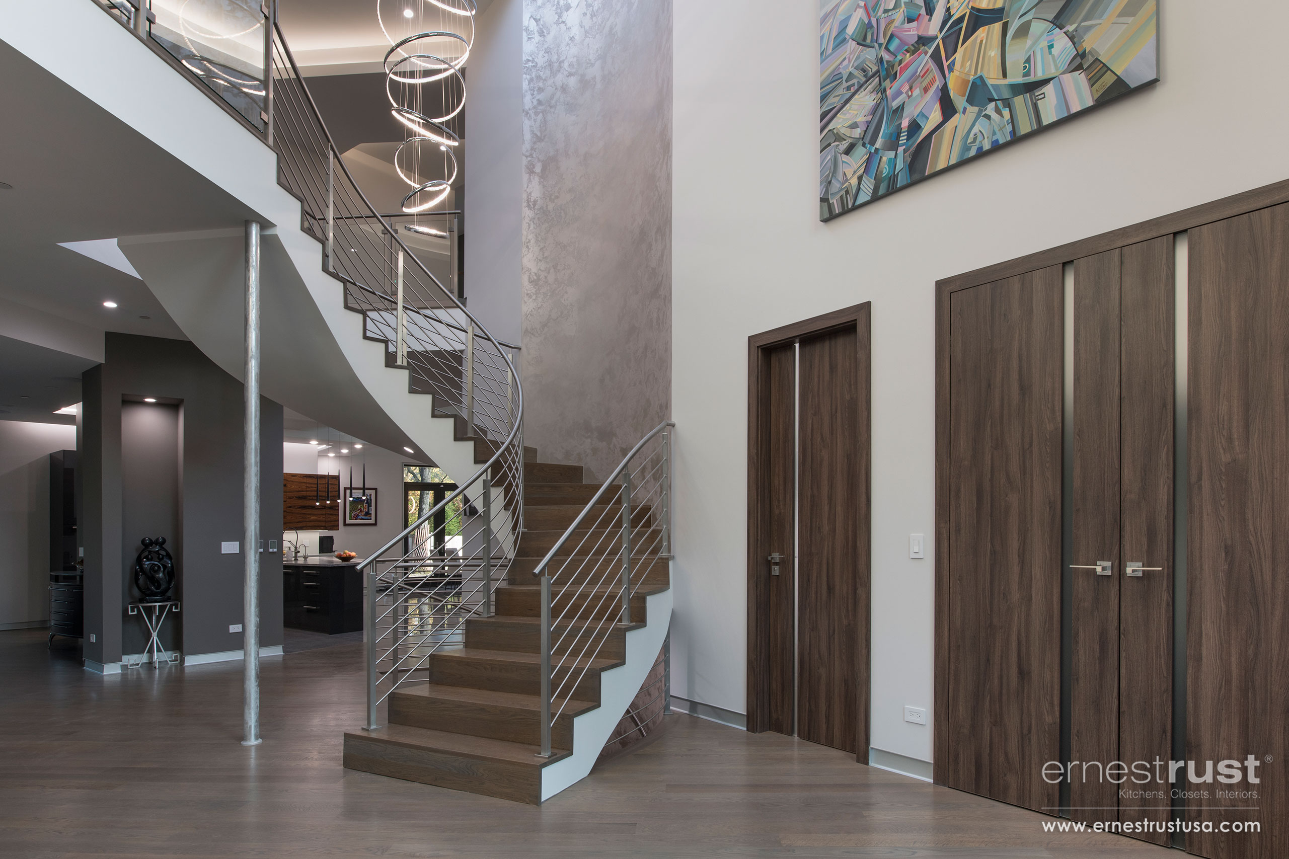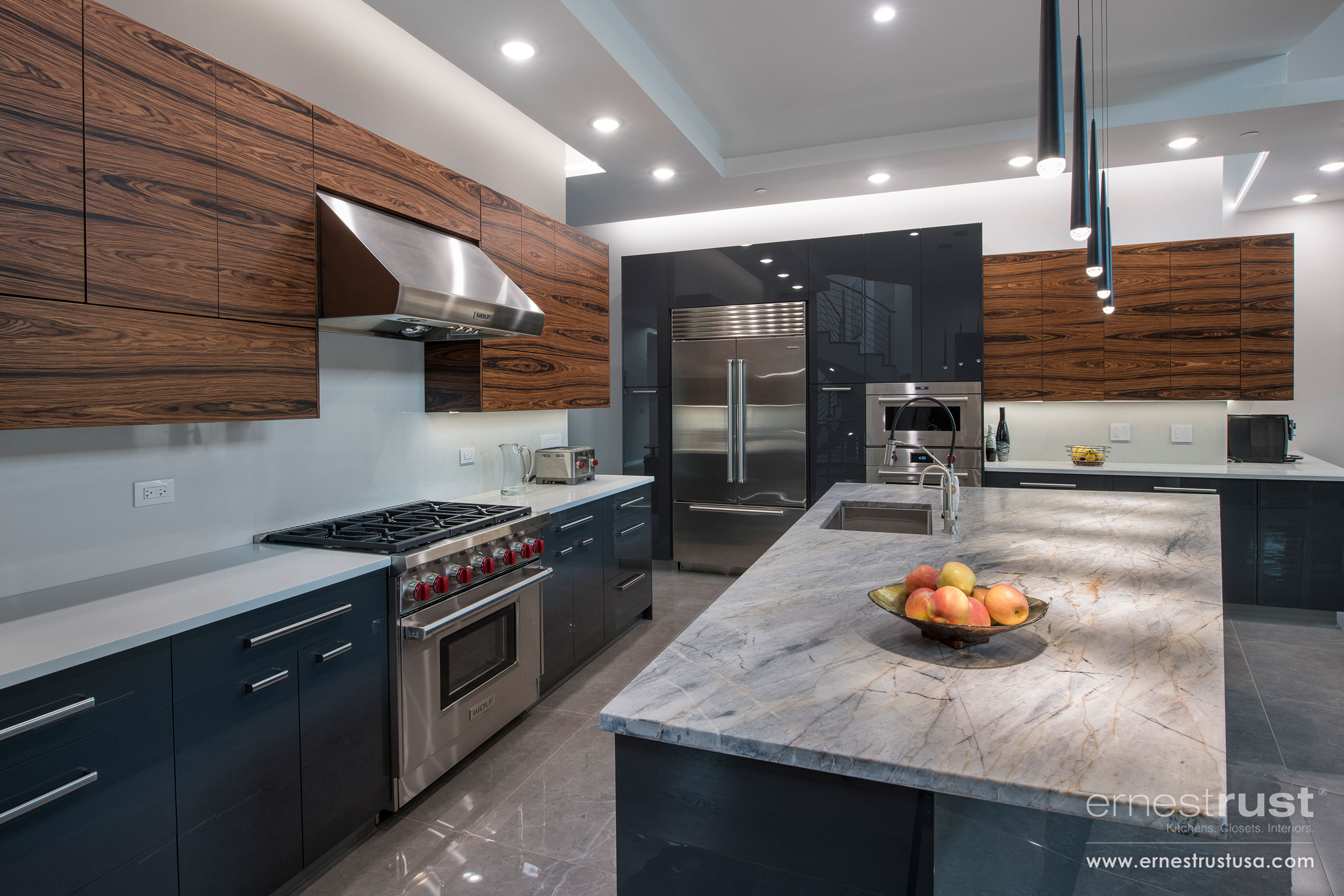 Our team had the pleasure to provide this Northbrook customer with an over-the-top modern kitchen to fit the aesthetic of their ultra-modern home. Showcasing our satin-matte varnish front, marble countertops, and natural rosewood veneer cabinetry, this kitchen is nothing short of spectacular. This project effortlessly combines several different materials and finishes and marries them together as one. Ernest Rust provides dozens of options when it comes to finishes; whether it’s a satin finish, a gloss finish, matte, or wood veneer, our inventory of selections will be able to deliver. All elements are working together to create a cohesive appearance throughout the entire home. The stainless steel handles and pulls are beautifully complementing the handpicked stainless steel appliances, as well as the stainless steel fixtures on the railings and light fixtures. It is important for our custom cabinetry to have options that suit all customers and can be effortlessly applied in every residence and project.